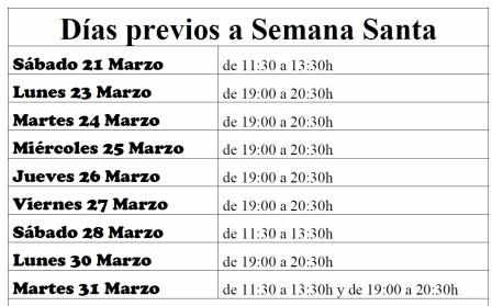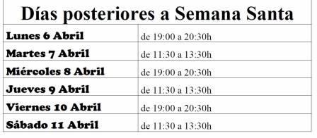 Una vez finalizada la Semana Santa, se debe proceder a la devolución del hábito en el mismo lugar de recogida y de acuerdo al siguiente horario: